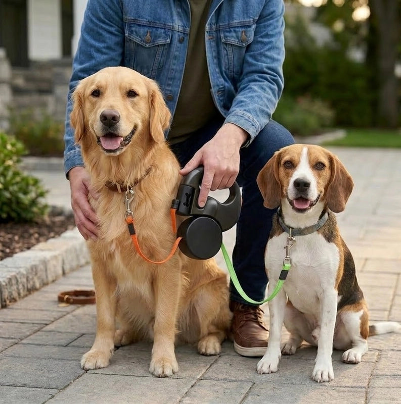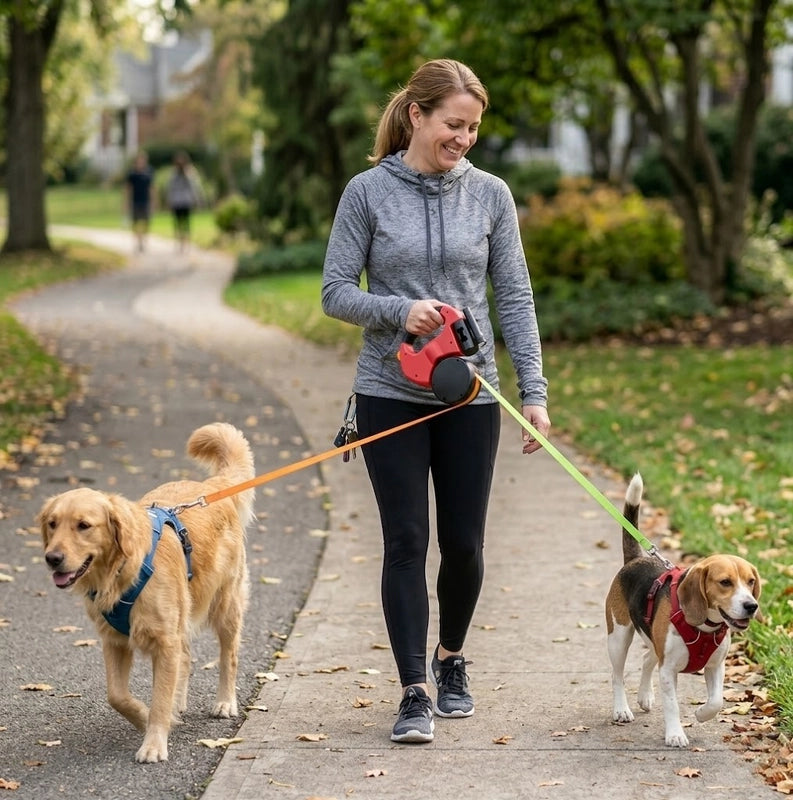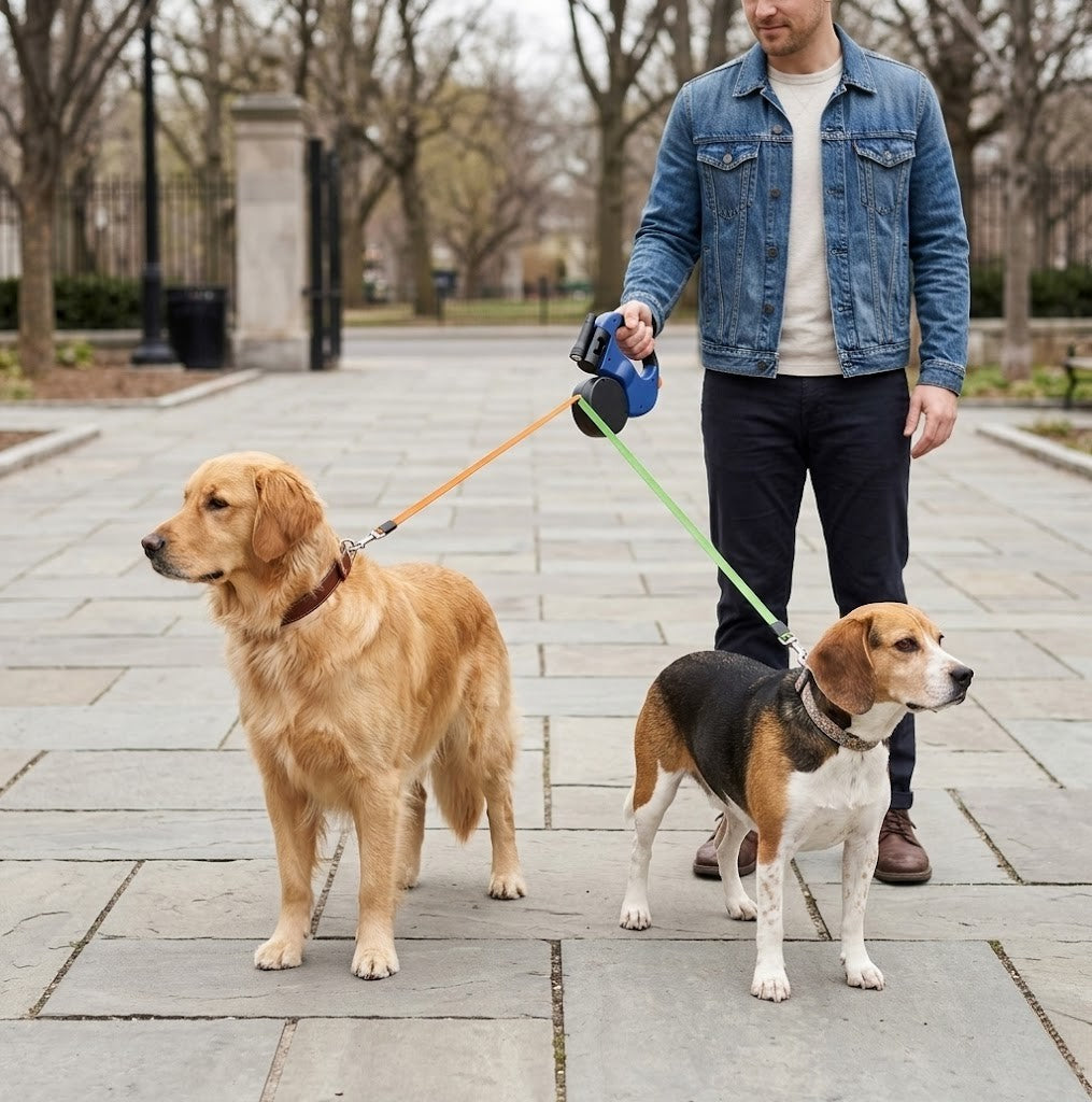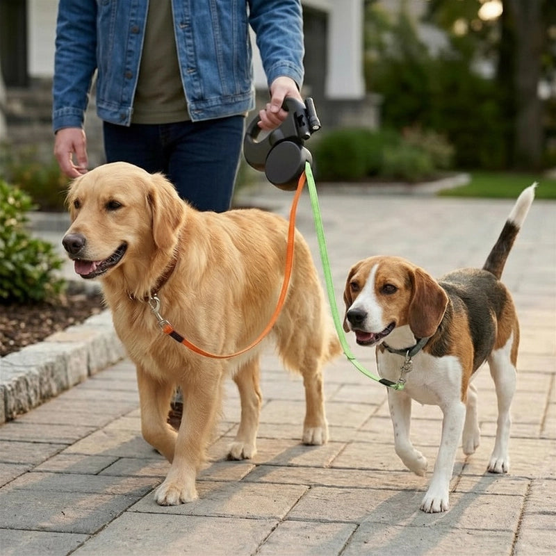 That's exactly what this was designed to solve. Both dogs connect through one single handle, so instead of juggling two separate leashes, you have one grip, one hand, and a retractable mechanism that lets you adjust both dogs' range on the fly.